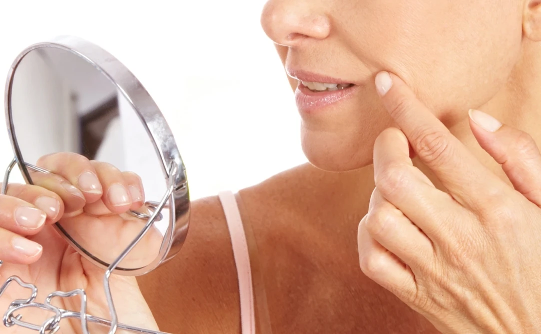 Rugas profundas na testa, ao redor dos olhos e boca, linhas de marionete e código de barras.
